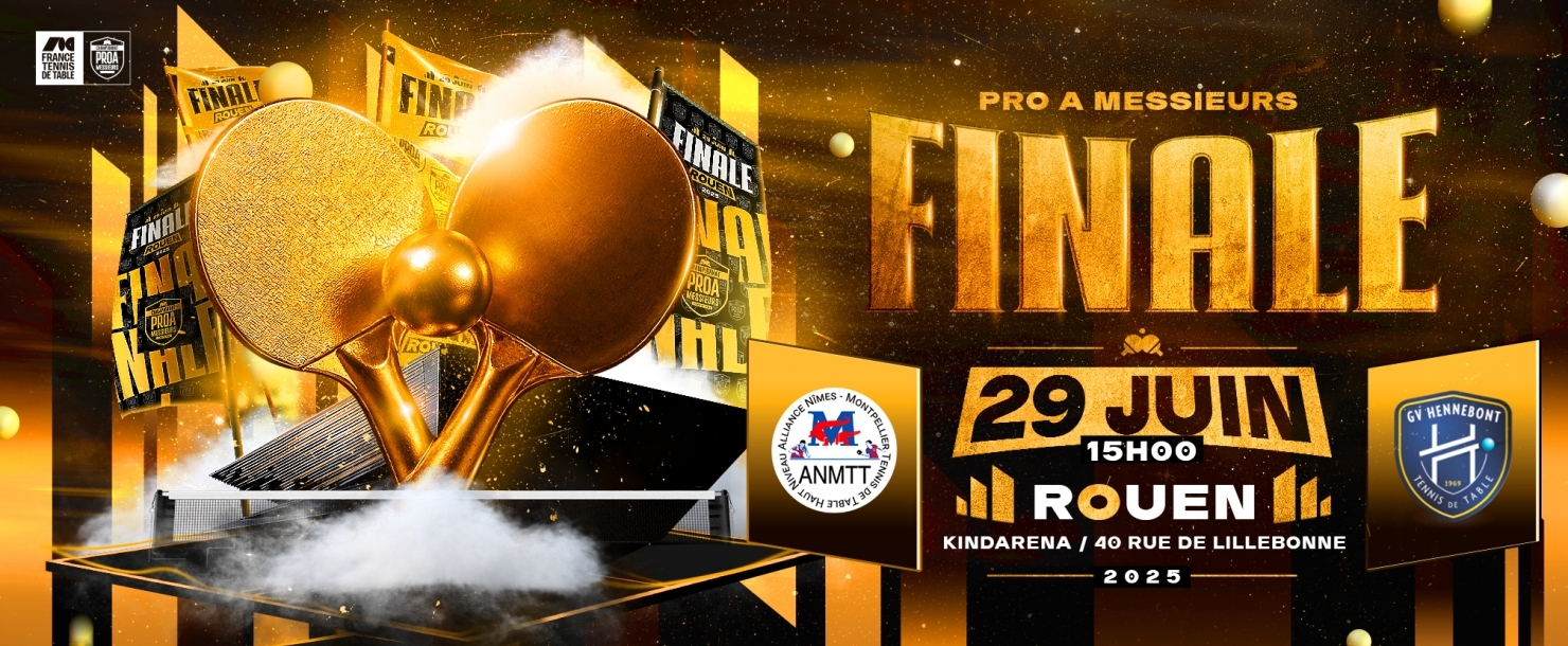 Réservez vos billets pour la finale de Pro A Messieurs !La Fédération Française de Tennis de Table a le plaisir d’annoncer l’ouverture officielle de la billetterie pour la grande finale du Championnat de Pro A Messieurs, qui se déroulera le dimanche 29 juin 2025 au Kindarena de Rouen. Un rendez-vous exceptionnel à ne pas manquer !