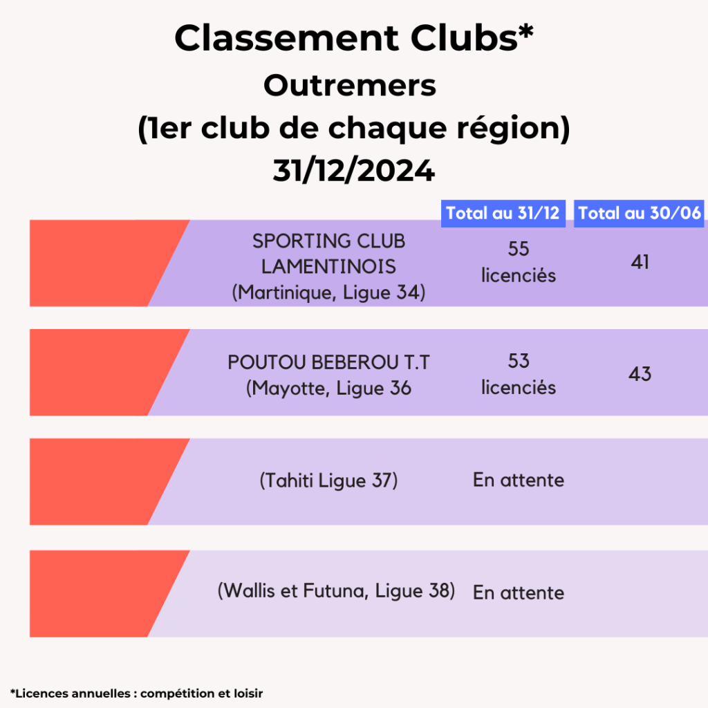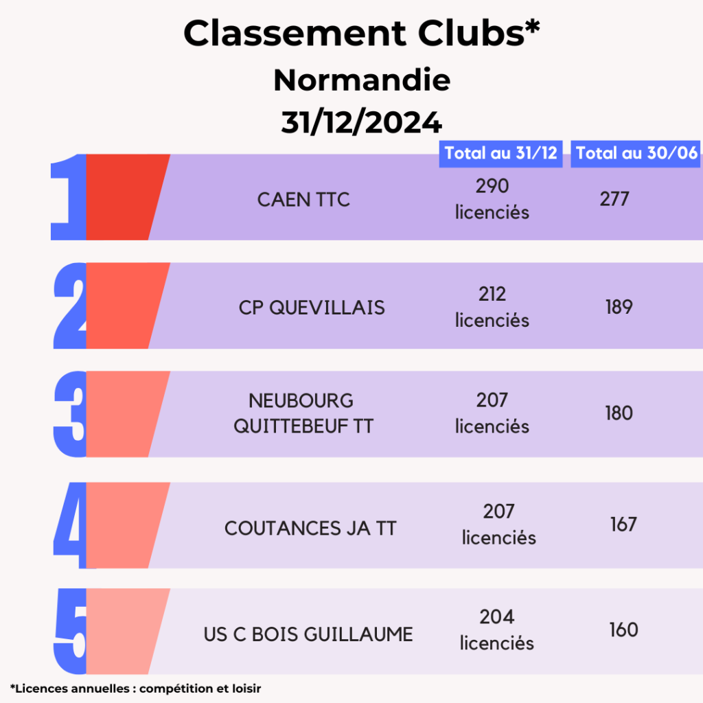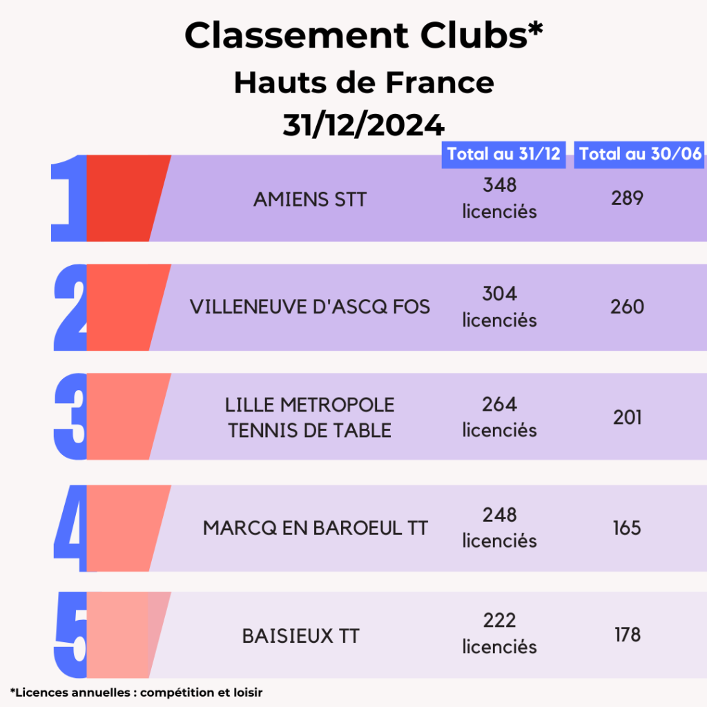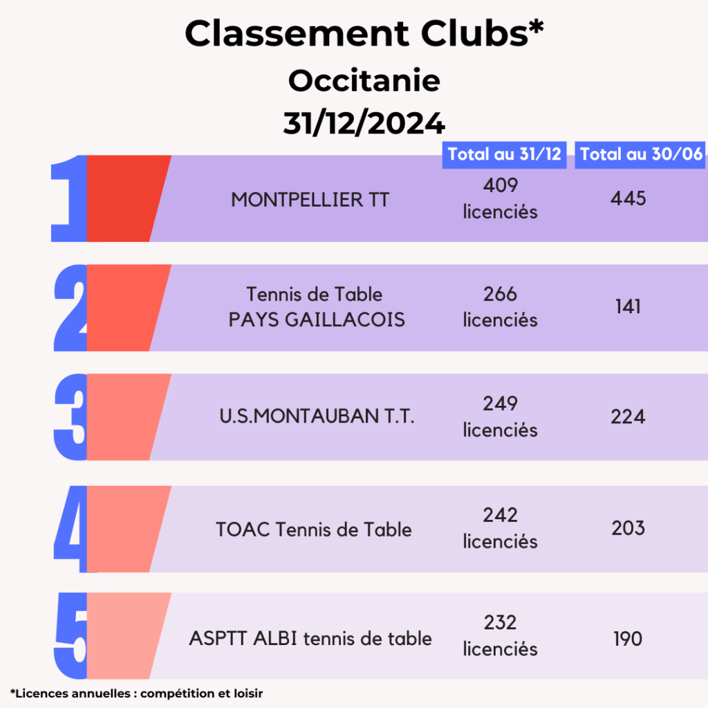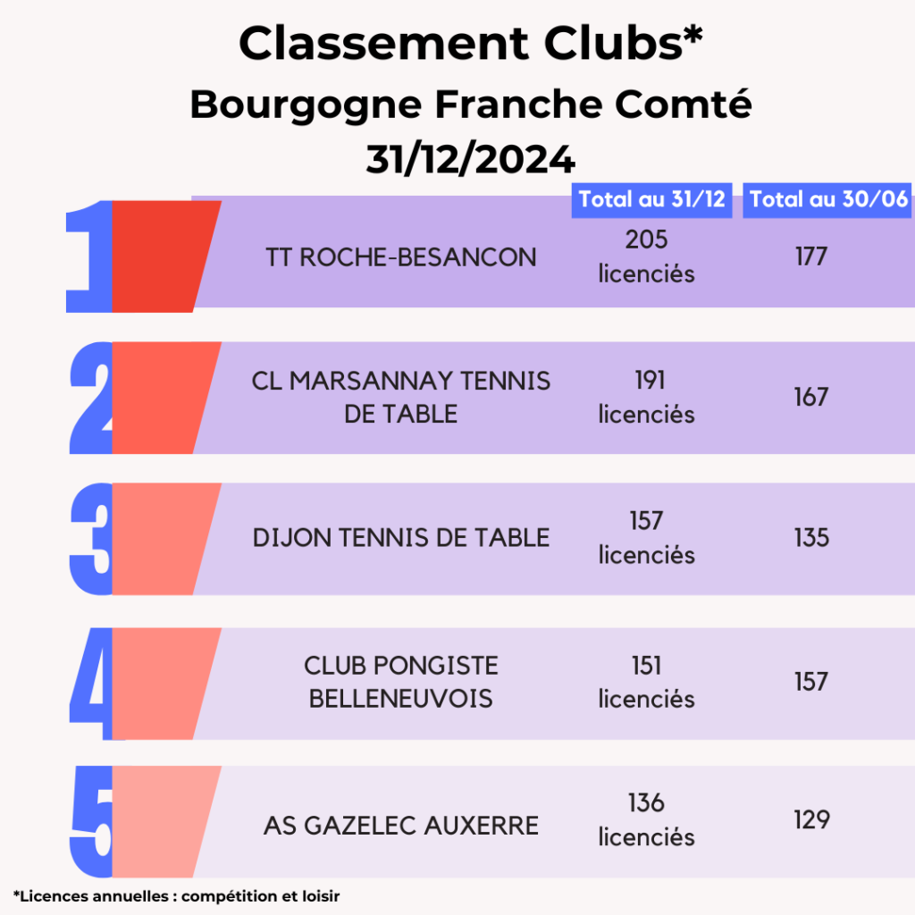 Lors de la saison 2024-2025, la FFTT peut compter sur l’engagement de ses 3 095 clubs affiliés et leurs bénévoles qui œuvrent au quotidien pour faire vivre le ping partout en France et poursuivre son développement. La FFTT souligne aujourd’hui leur dynamique et les félicite par ce Top 20 des clubs par licenciés au 31 décembre avec leur progression par rapport à juin 2024. Découvrez également ci-dessous les tops 5 des clubs par région.