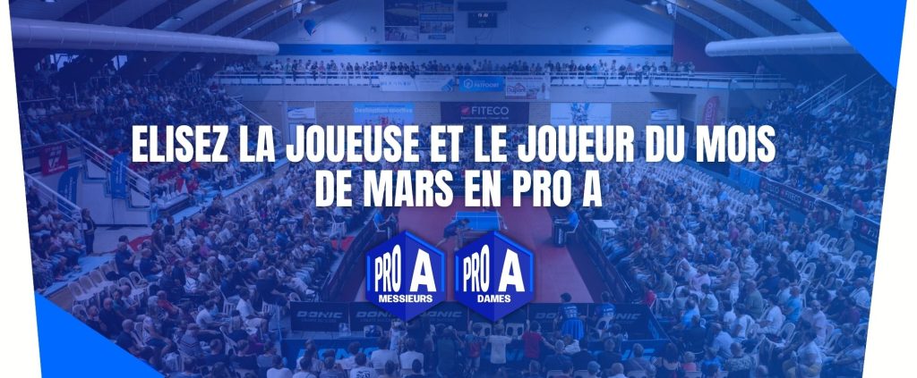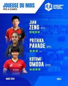 Comme depuis le début de l’année, nous vous donnons la possibilité d’élire la joueuse et le joueur du mois en Pro A. Depuis le début de la saison, nous avons la chance d’assister à des performances incroyables et de voir jouer les tous meilleurs pongistes de la planète. C’est donc le moment de mettre en lumière celles et ceux qui vous ont le plus impressionné(e)s au mois de mars. Qui succéderont à Xiaotong Zang & Florian Bourrassaud ?