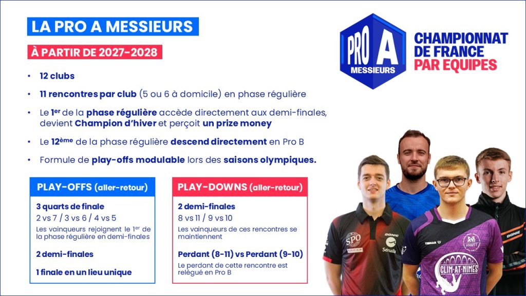 A partir de la saison 2027-2028, le nombre de clubs en Pro A messieurs passera de 10 à 12. Lors de la phase régulière, il y aura une seule confrontation par adversaire, soit onze rencontres par équipe, au lieu des dix-huit matches joués en aller-retour actuellement. La saison se poursuivra ensuite par des play-offs en matchs aller-retour, qui débuteront par des quarts de finale joués par les équipes classées de 2 à 7, puis des demi-finales auxquels le premier de la saison régulière sera directement qualifié, avant de se conclure par d’une grande finale disputée sur un match décisif. La nouveauté est également l’apparition de play-downs, disputés en matchs aller-retour par les équipes classées de 8 à 11, le dernier de la saison régulière étant directement relégué en Pro B, qu’il rejoindra avec le perdant des play-downs.