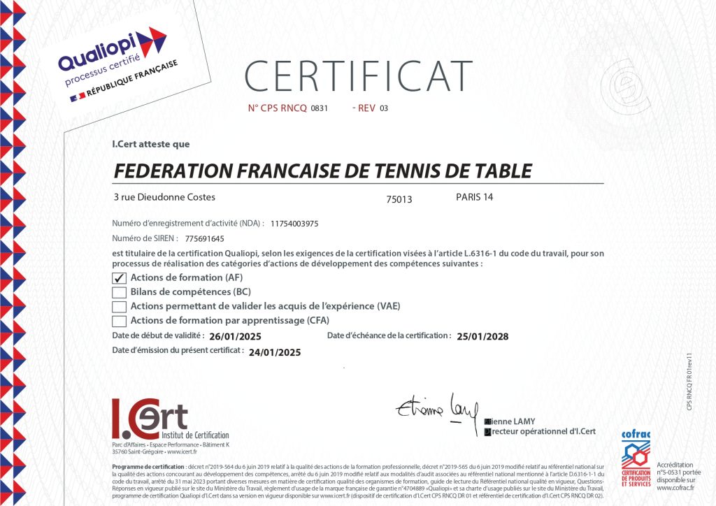 « Dans le cadre de son projet de développement, la Fédération Française de Tennis de Table (FFTT) s’appuie sur l’Institut fédéral de l’emploi et de la formation (IFEF) certifié Qualiopi jusqu’au 25/01/2028