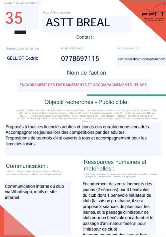 – Encadrement des entraînements des jeunes (2 séances) par 3 bénévoles du club dont 1 bénévole initiateur de club.