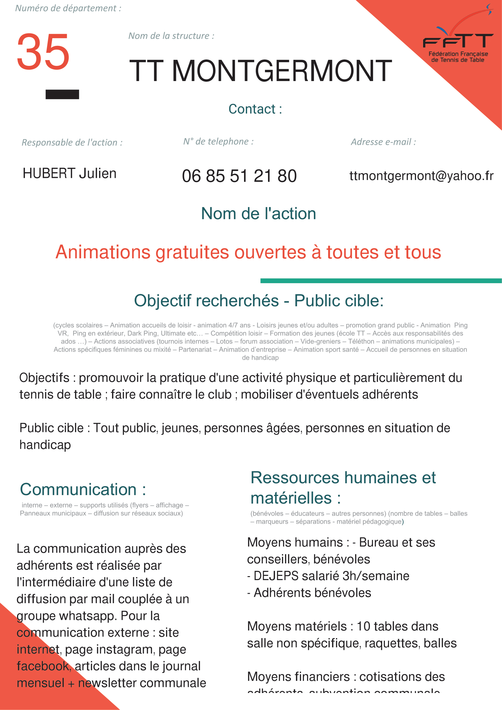 Objectifs : promouvoir la pratique d’une activité physique et particulièrement du tennis de table ; faire connaître le club ; mobiliser d’éventuels adhérents