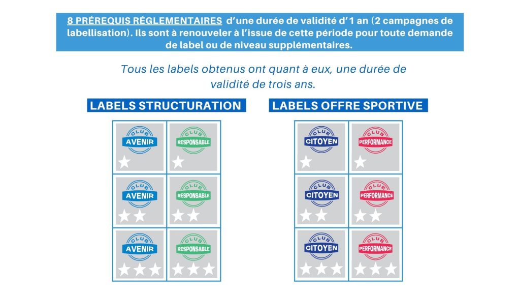 - 2 labels (Avenir et Responsable), abordent les thématiques de structuration, d’organisation, de politique de ressources, de communication, de formation…